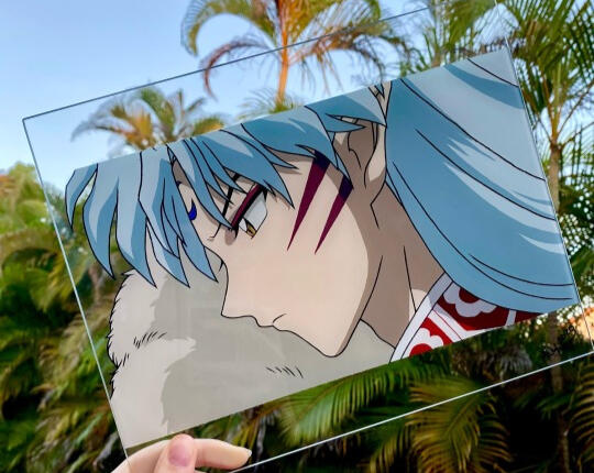 Some of my favorite glass paintings to date. As of right now, I've made over 50 individual pieces, and I continue to create more everyday! Smaller pieces can take me a modest 5-7 hours, while other larger pieces, 11 by 17 inches like the Sesshomaru pictured, can take me 20+ hours to complete.